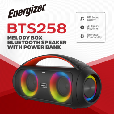 הכירו את ה-MELODY BOX BTS258 מבית ענקית האנרגיה העולמית אנרג'ייזר (Energizer) – הרבה יותר מסתם רמקול נייד! מדובר במערכת בידור אלחוטית שלמה וקומפקטית, שתוכננה להרים כל מסיבה, פיקניק או מפגש חברתי. הרמקול מפיק סאונד עשיר, צלול ועוצמתי שמתפזר בצורה מעולה בחלל, ומציע קישוריות בלוטוס (Bluetooth) חלקה ומהירה להזרמת מוזיקה ישירות מהסמארטפון או הטאבלט שלכם. גולת הכותרת של דגם זה היא סוללת הגיבוי (Power Bank) המובנית – כיאה למותג Energizer, המכשיר מצויד בסוללה פנימית חזקה המאפשרת לכם לא רק ליהנות משעות ארוכות של מוזיקה, אלא גם להטעין את הטלפון הנייד שלכם תוך כדי, כך שלעולם לא תישארו עם סוללה ריקה באמצע המסיבה!