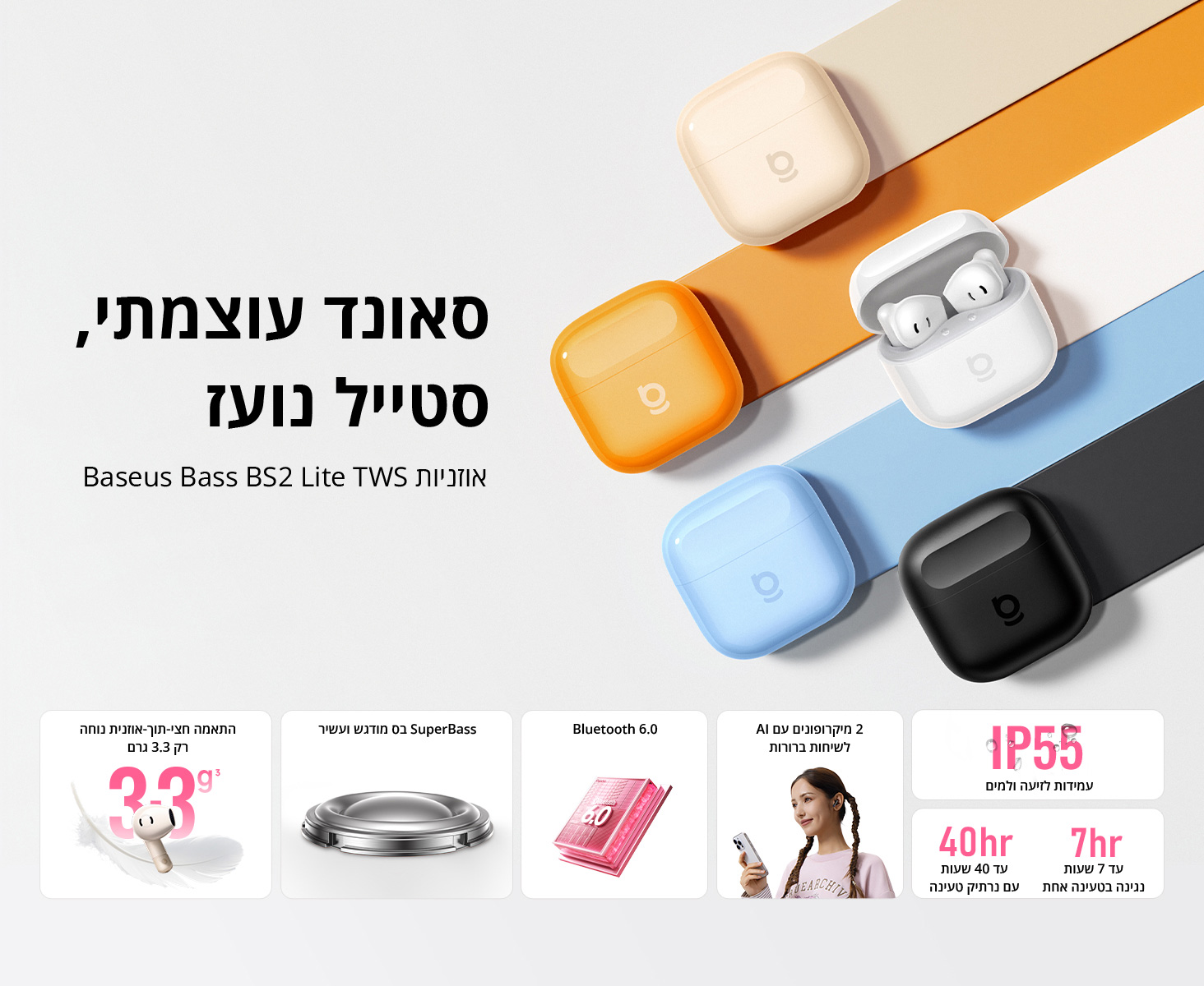 מחפשים חוויית שמע מצוינת מבלי לקרוע את הכיס? הכירו את האוזניות האלחוטיות מדגם Bass BS2 Lite של מותג הסלולר והגאדג'טים הפופולרי בזוס (Baseus). האוזניות הללו מציעות את השילוב המושלם בין עיצוב מינימליסטי ונקי בצבע לבן קלאסי, לבין סאונד עשיר עם דגש מיוחד על תדרי הבס, בדיוק כפי שהשם שלהן מרמז. הן עוצבו במבנה ארגונומי קליל במיוחד, כך שהן יושבות בתוך האוזן בנוחות מרבית גם בהאזנה ממושכת – אידיאלי לנסיעות, לעבודה במשרד, להליכות או לאימוני כושר.