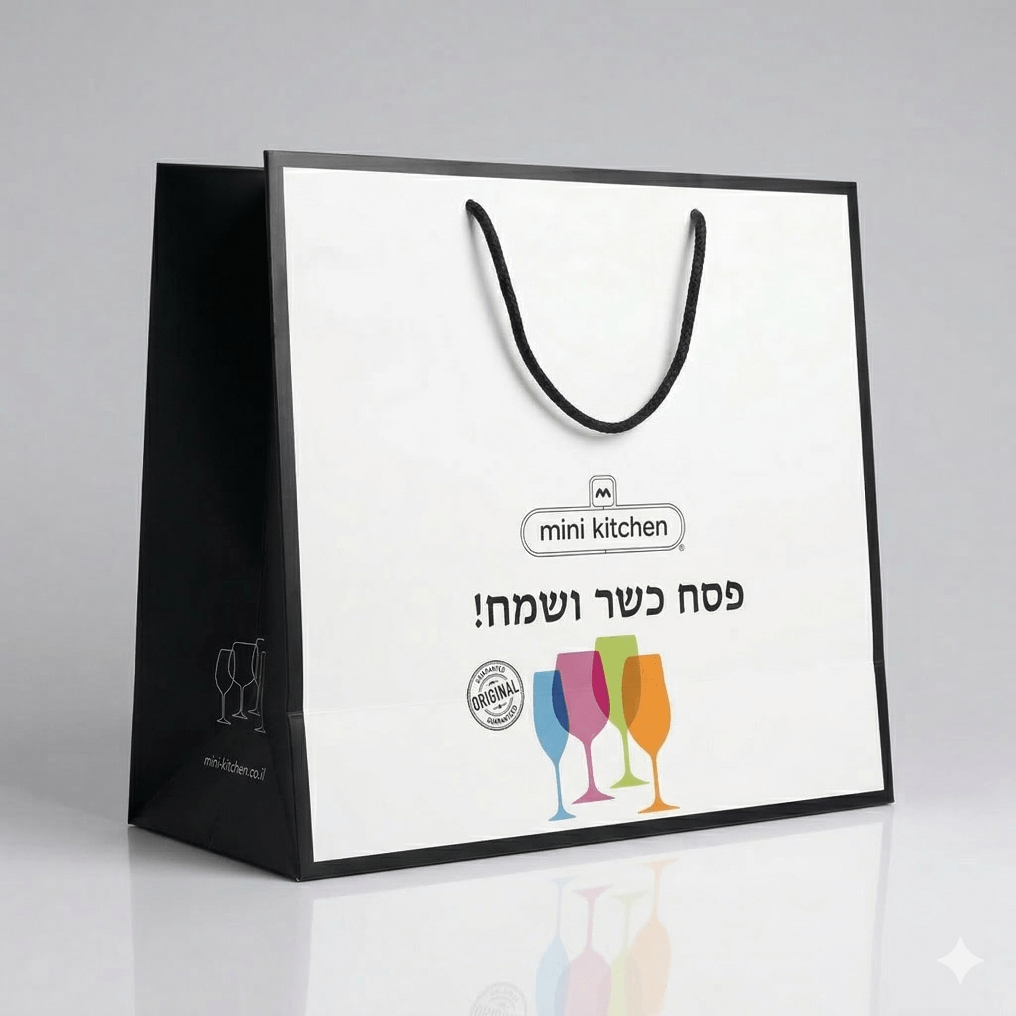שקית הנשיאה המקורית והממותגת של "מיני קיטשן" (Mini Kitchen) במהדורת חג מיוחדת וחגיגית, הנושאת את הברכה "פסח כשר ושמח!". השקית תוכננה במיוחד כדי להעניק פתרון אריזה מושלם, אלגנטי ומרשים למי שבוחר להעניק את מכשיר הפלא או את האביזרים הנלווים שלו כמתנה חגיגית (או כמתנת אפיקומן מושקעת) לקראת חג הפסח.