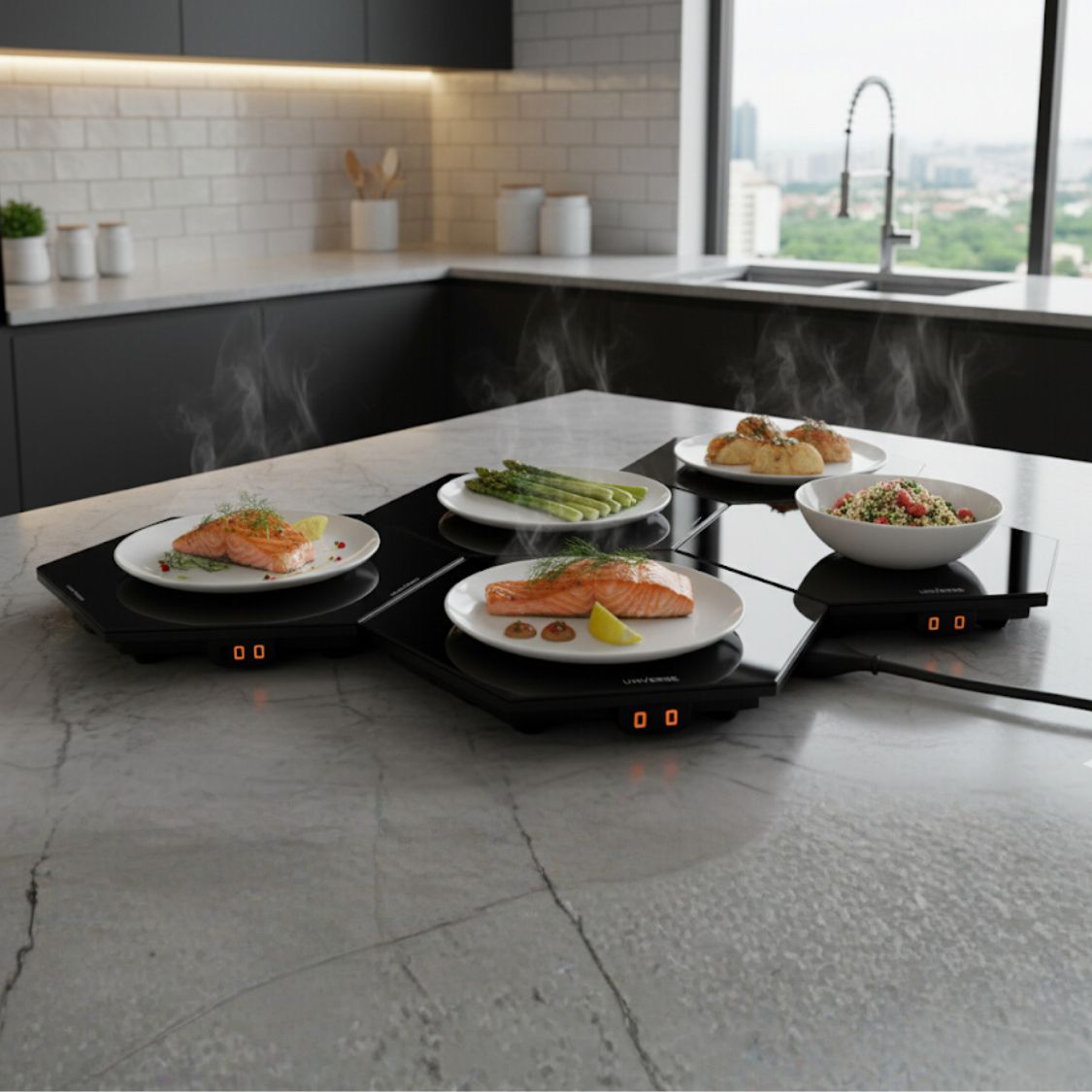 המהפכה בשולחן השבת: פלטה מודולרית שמתאימה את עצמה אליכם. תשכחו מפלטות המתכת המגושמות והמכוערות. סט פלטות השבת של UNIVERSE (דגם NRI-956X4) משלב עיצוב יוקרתי עם פונקציונליות חכמה שמשנה את חוקי האירוח. מדובר בסט של 4 יחידות חימום עצמאיות העשויות זכוכית מחוסמת בצבע שחור אלגנטי, המתחברות זו לזו בשרשור פשוט.